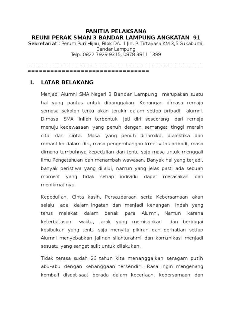 Text of contoh proposal reuni smp. Contoh proposal kegiatan sekolah, osis, pramuka, rohis, pentas seni, festival musik, lomba futsal, olahraga, kerja bakti, gotong royong, karang taruna, bakti sosial, seminar, reuni akbar, tabligh akbar. Proposal merupakan salah satu komponen yang wajib ada untuk sebuah agenda. Proposal adalah pengajuan dana untuk sebuah kegiatan yang diadakan disekolah, tempat ibadah, ataupun kegiatan umum di masyarakat. 3 tujuan memperingati 25 tahun angkatan 1984 smp 27 jakarta (reuni perak) mempererat tali silaturahmi diantara sesama alumni dan dengan guru smp 27 jakarta membangun sinergi dan.